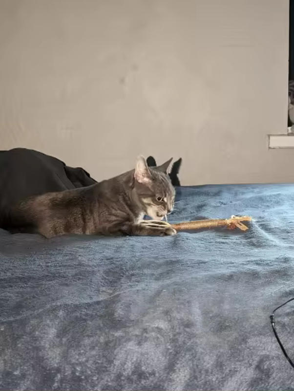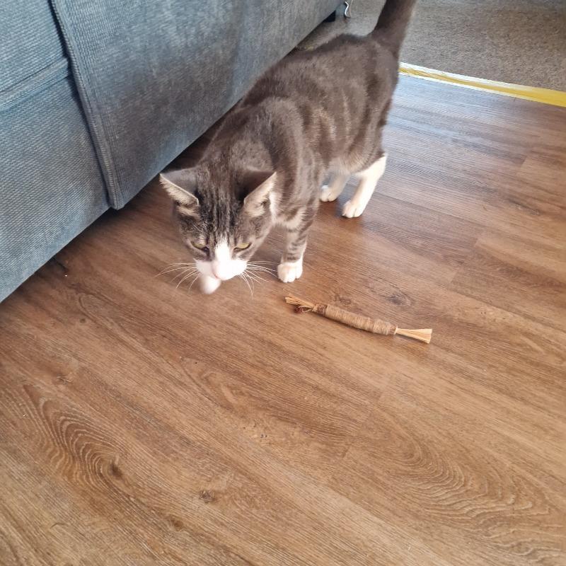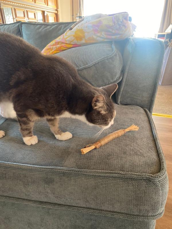 Spielzeug mit Knabber-Spaß, was möchte man mehr? Der Geruch kam auch gut an. Mein Kater ist überzeugt