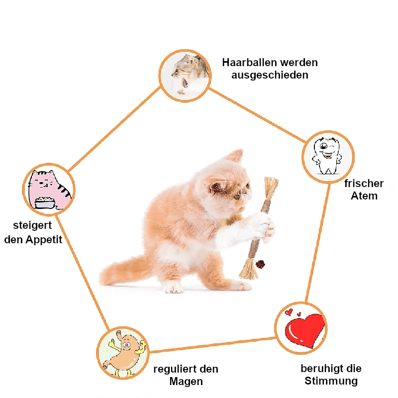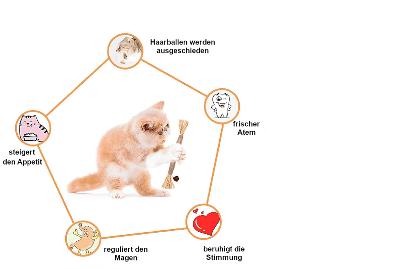 Ein großer Nutzen ist, dass die Gesundheit Deiner Katze gefördert wird. Durch das Kauen wird der Appetit angeregt sowie der Magen und die Verdauung reguliert. Haarballen werden dadurch leichter ausgeschieden.